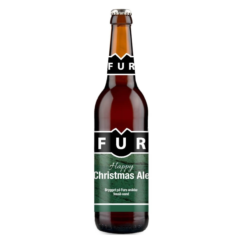 Ølflaske med brun farve, grøn/sort etiket, "FUR", "Happy Christmas Ale", "Fossile-vand".