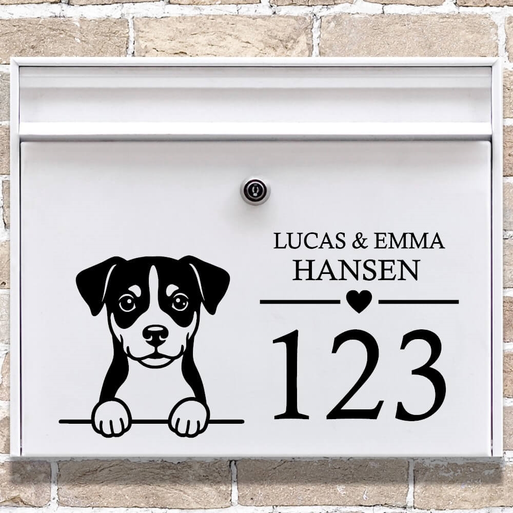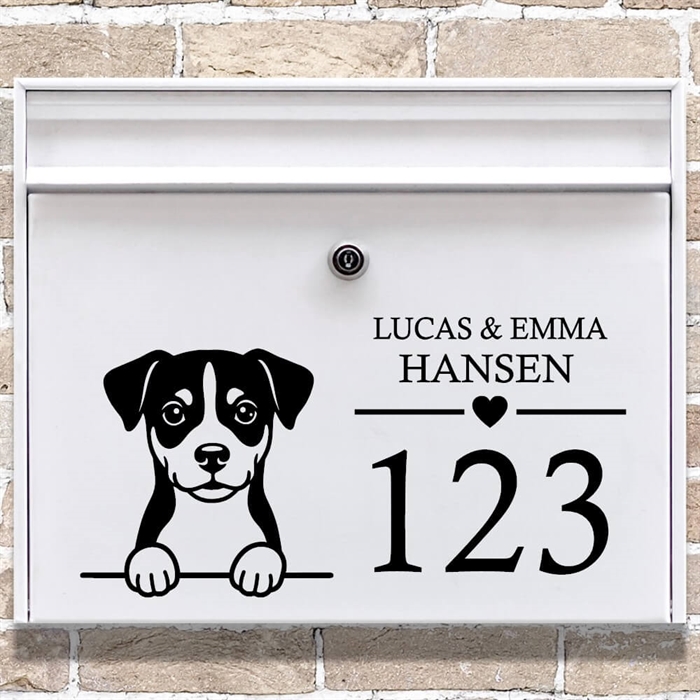Postkasse sticker med dansk svensk gårdhund og navn