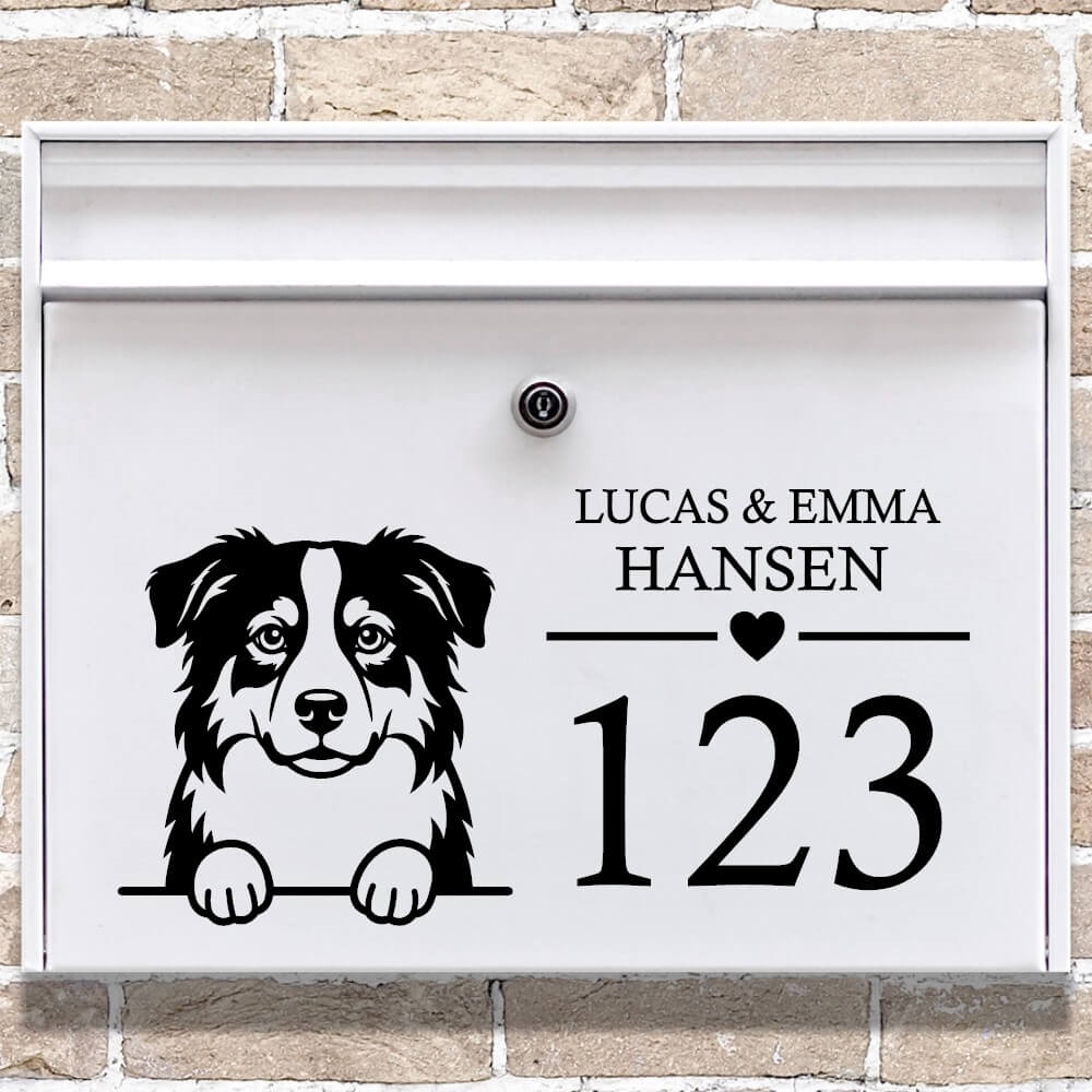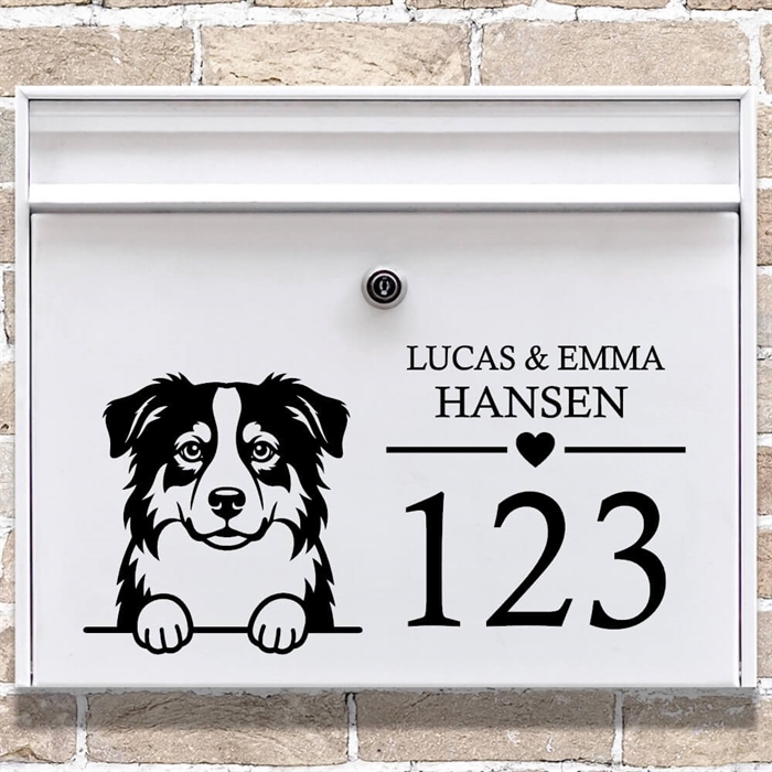 Postkasse sticker med Australsk Shepherd og navn