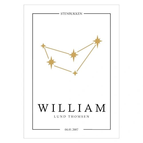 Stenbukken er født mellem den 22. december og 20. januar og er et jordtegn. Dette stjernetegn symboliserer ambitioner og hårdtarbejdende personligheder. Folk ser op til stenbukken, da de altid har styr på sagerne og er villige til at påtage sig ansvar. Hvis du ønsker at fejre dit barns fødselstidspunkt eller bare ønsker at inspirere dem til at være ambitiøse og målrettede, er denne plakat et godt valg.